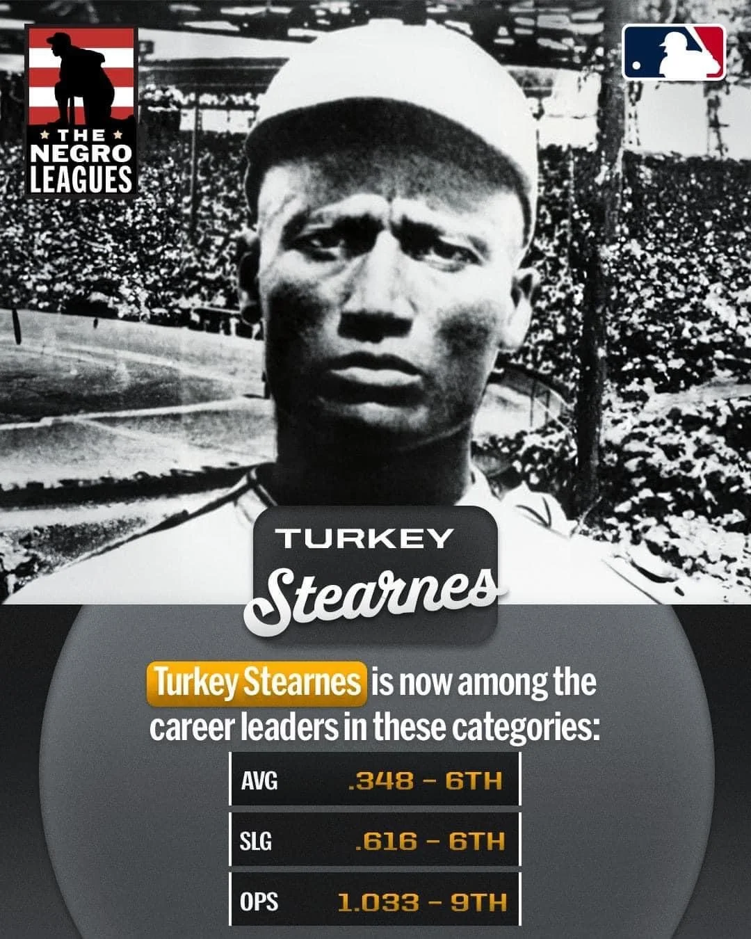 MLB officially incorporated the statistics of more than 2,300 former Negro League players from 1920-1948 to the MLB database to validate their historical greatness. Now Turkey Stearnes is one of the top career leaders in 3 categories: career batting average .348 (6th place), slugging percentage .616 (6th place) and OPS 1.033 (9th place). He is also first in home runs (187), on the Baseball Reference site.